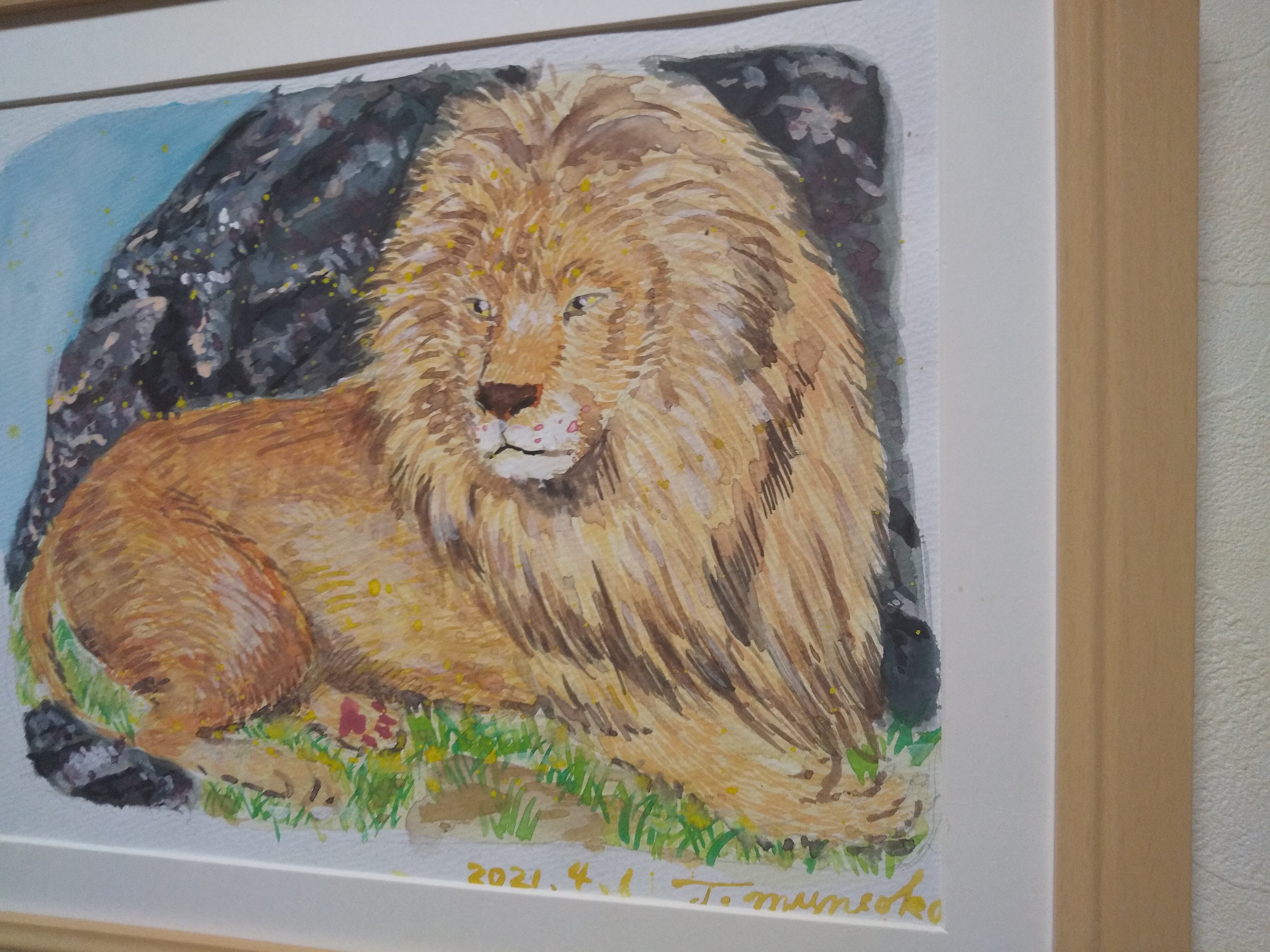 ライオン 水彩 額装 サイズ 縦26.5cm 横31.5cm 色 ナチュラル 額付き