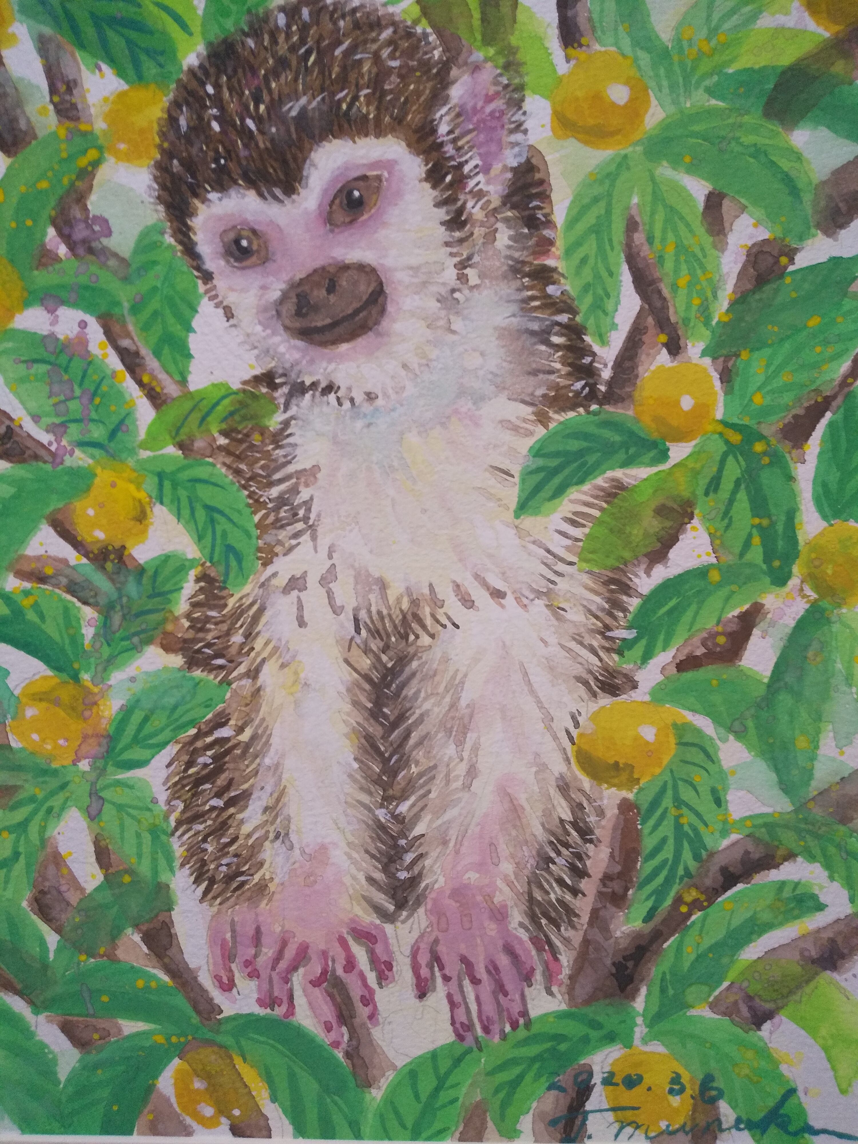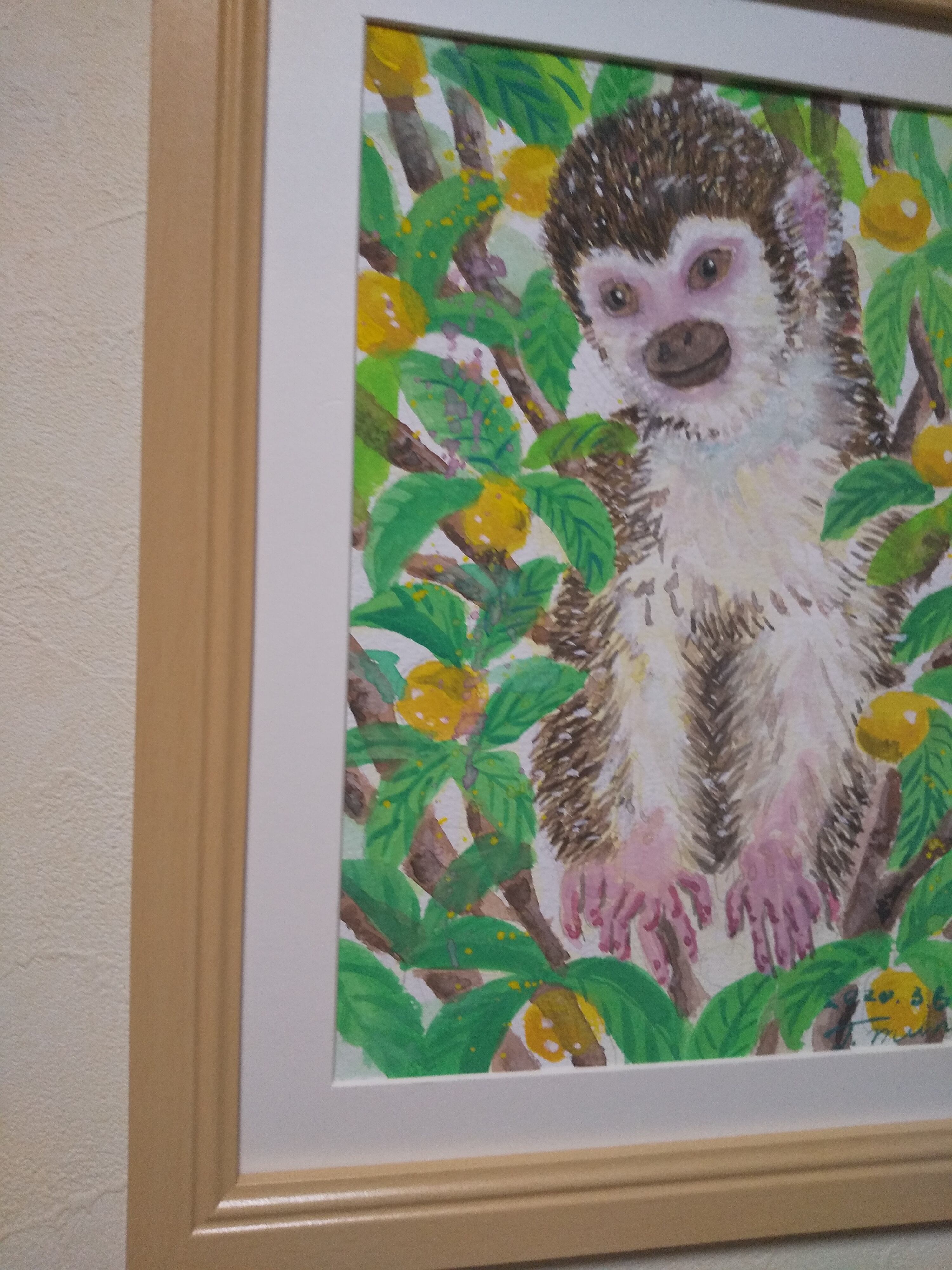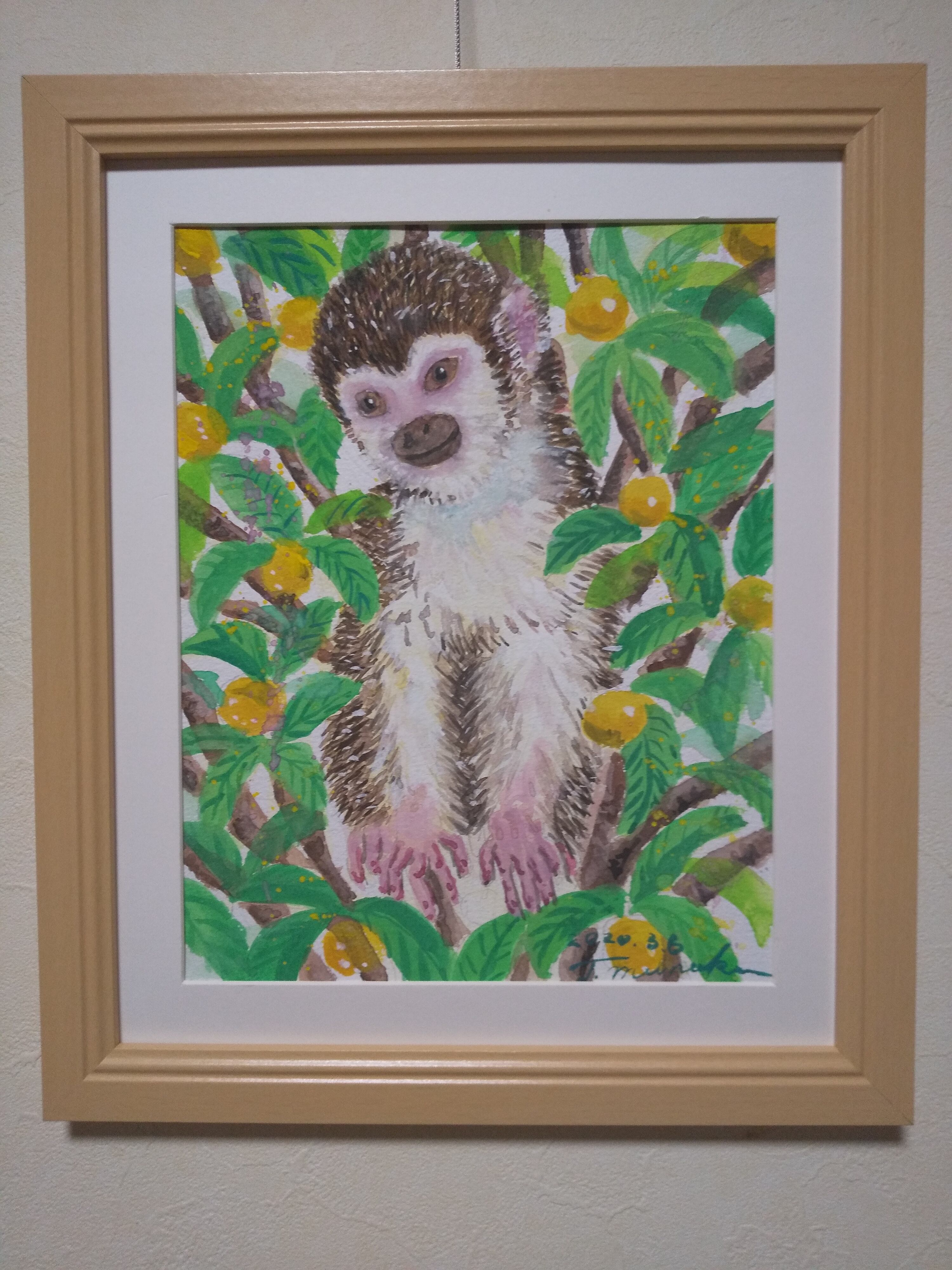 リスザル 水彩 額装 サイズ 横26.5cm 縦31.5cm 色 ナチュラル 額付き