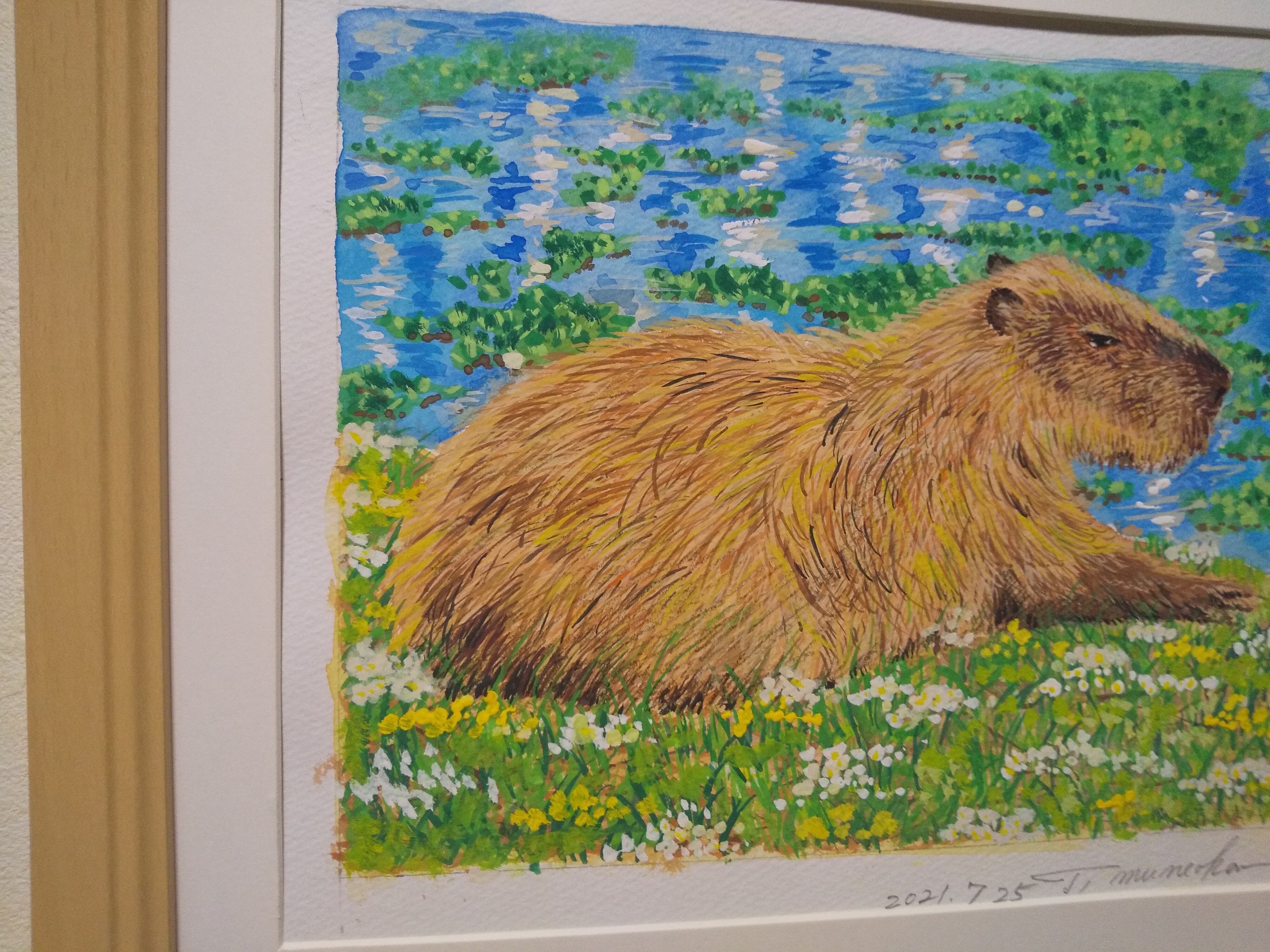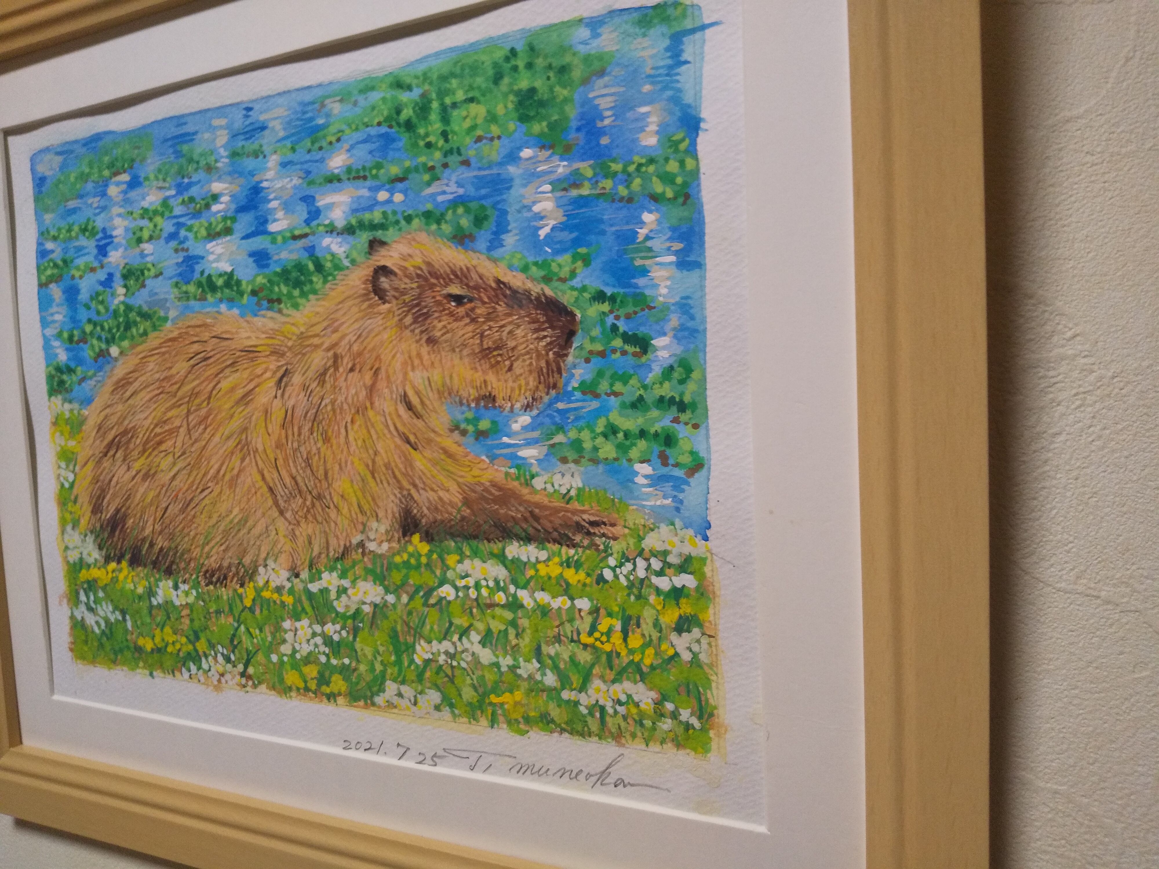 カピパラ 水彩 額装 サイズ 縦26.5cm 横31.5cm 色 ナチュラル 額付き