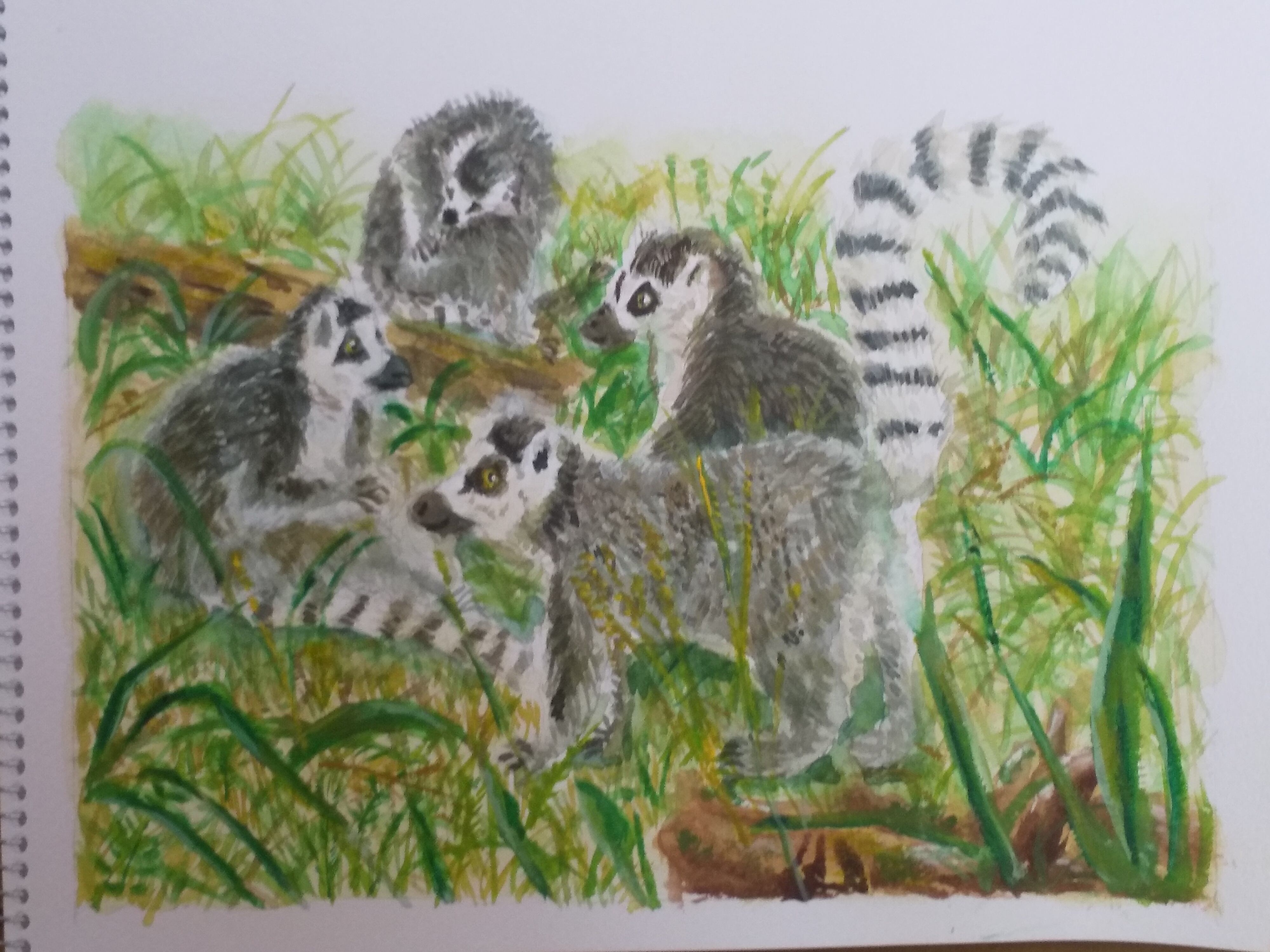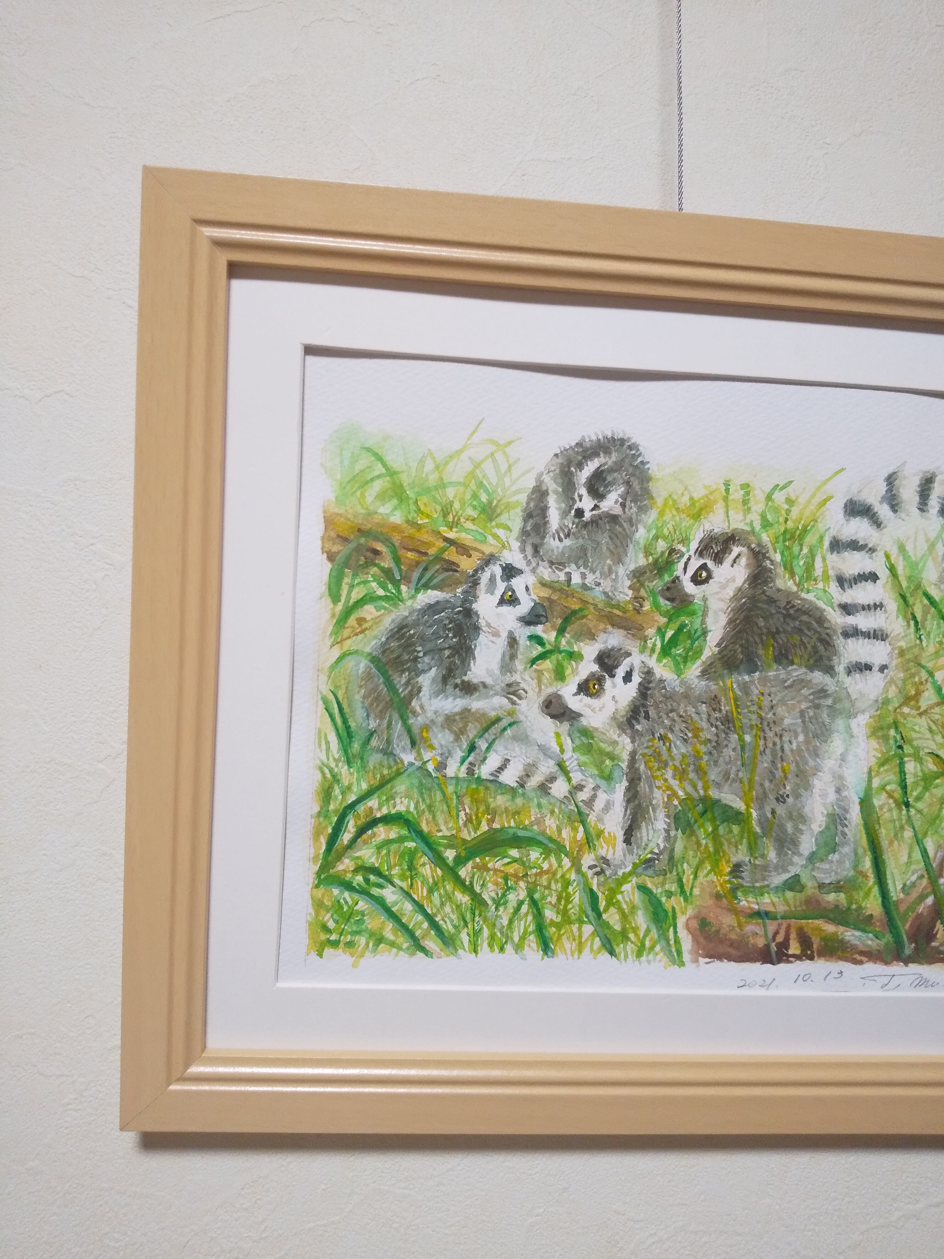 ワオキツネザル 水彩 額装 サイズ 縦26.5cm 横31.5cm 色 ナチュラル 額付き