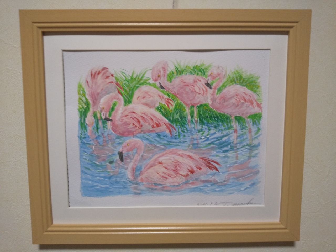 フラミンゴたち 水彩 額装 サイズ 縦26.5cm 横31.5cm 色 ナチュラル 額付き