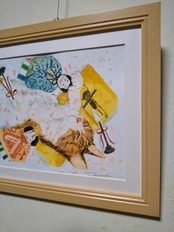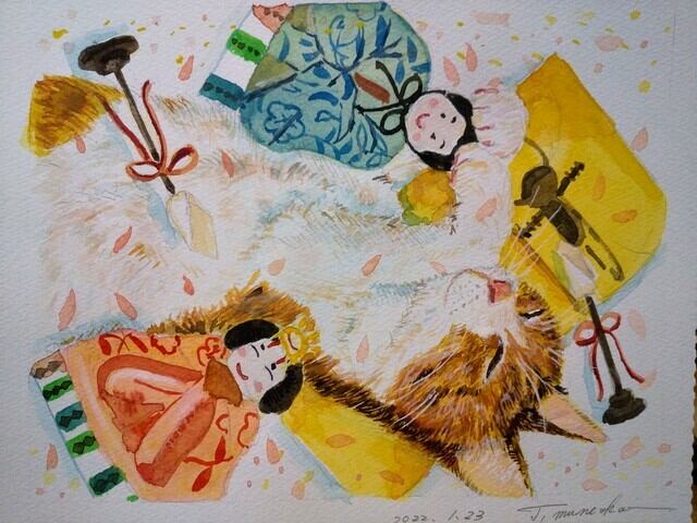 お雛様 イエロー 水彩 額装 サイズ 縦26.5cm 横31.5cm 色 ナチュラル 送料込みです。
