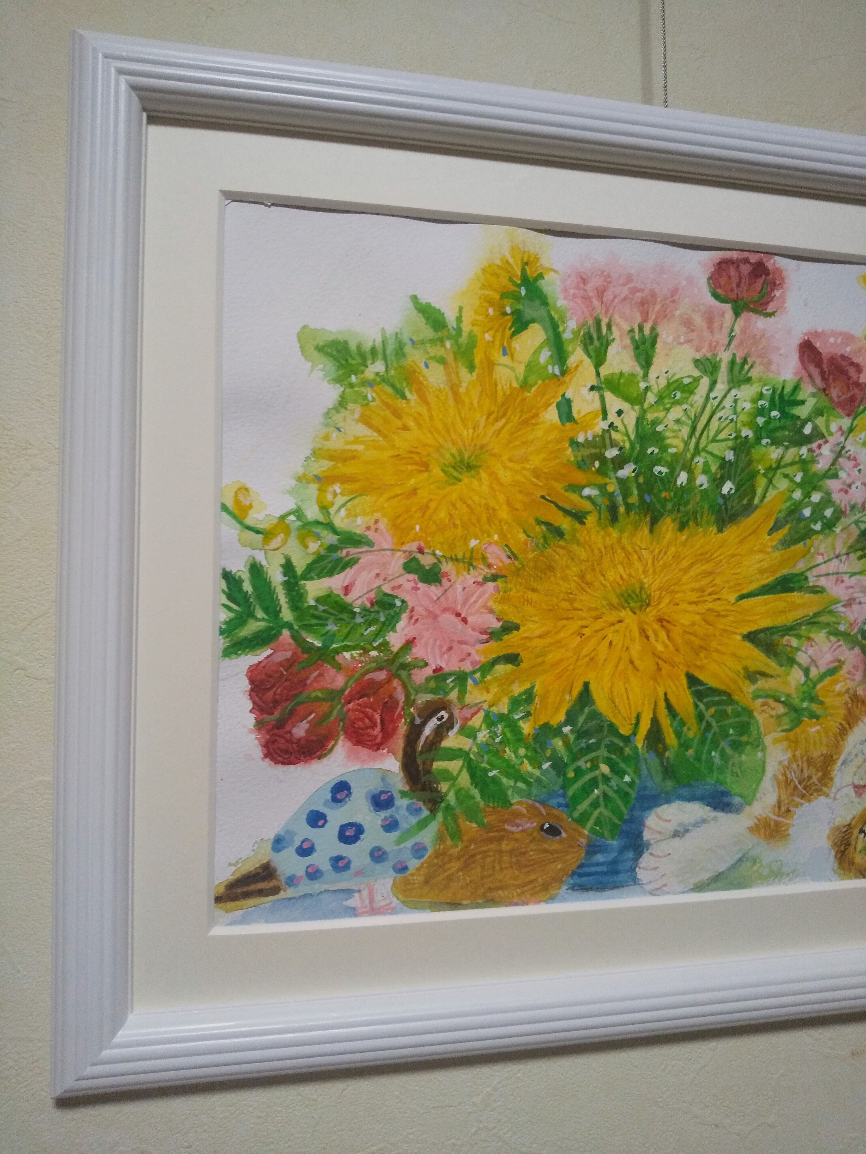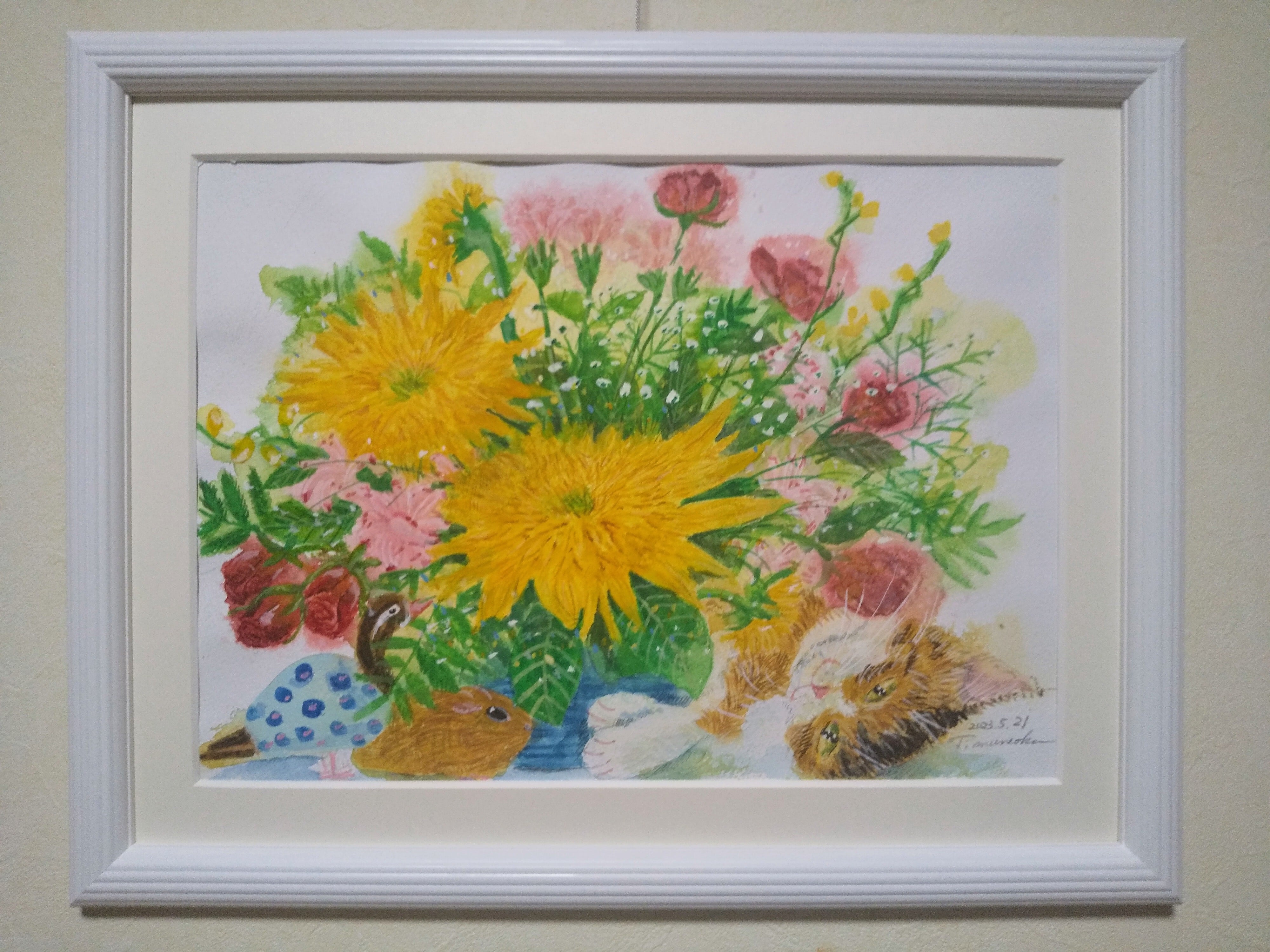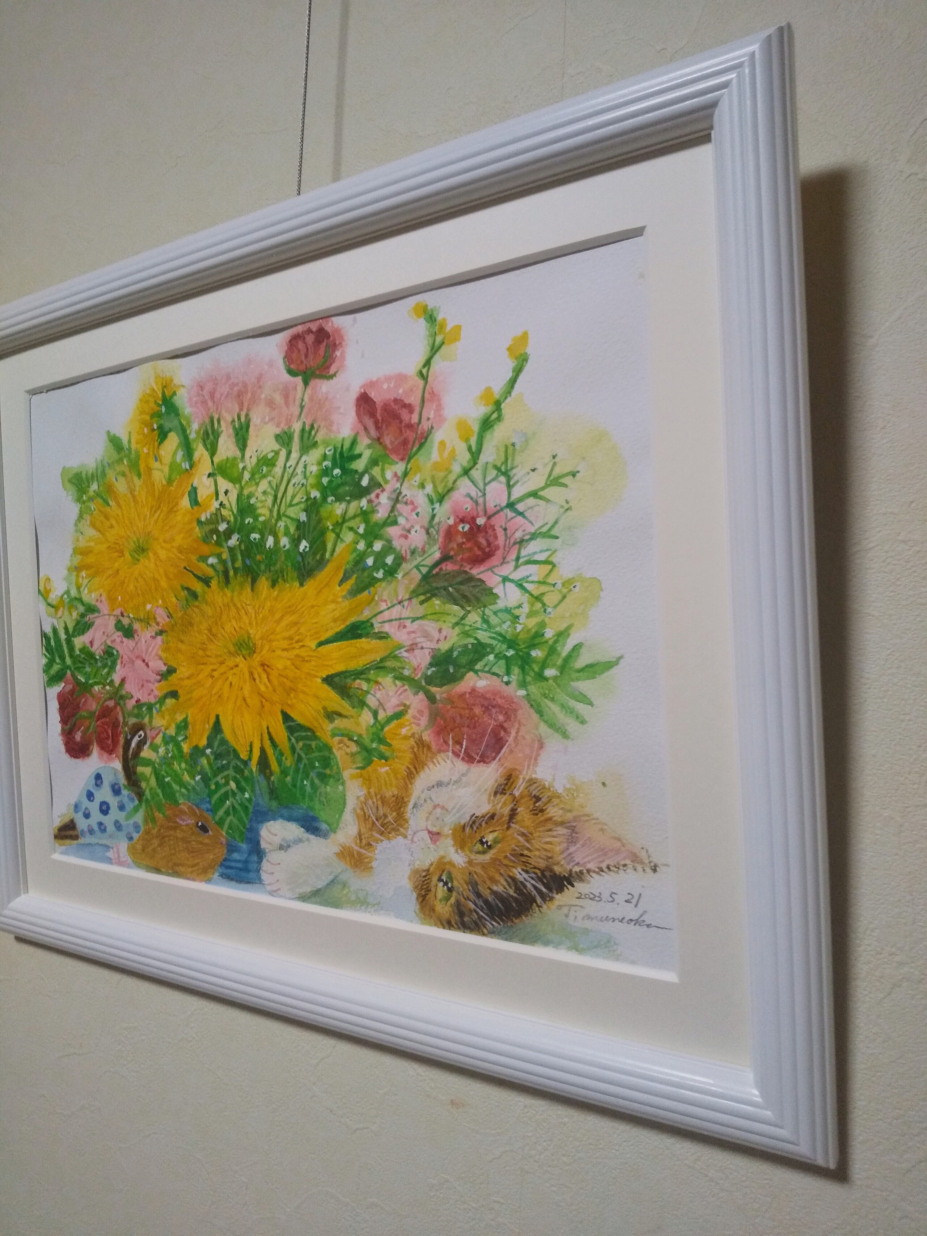 水彩 原画です 額装 サイズ 横42cm 縦32cm 色 ホワイト 額付き 制作動画 https://youtu.be/2qP2x6KomFo 送料込みです。