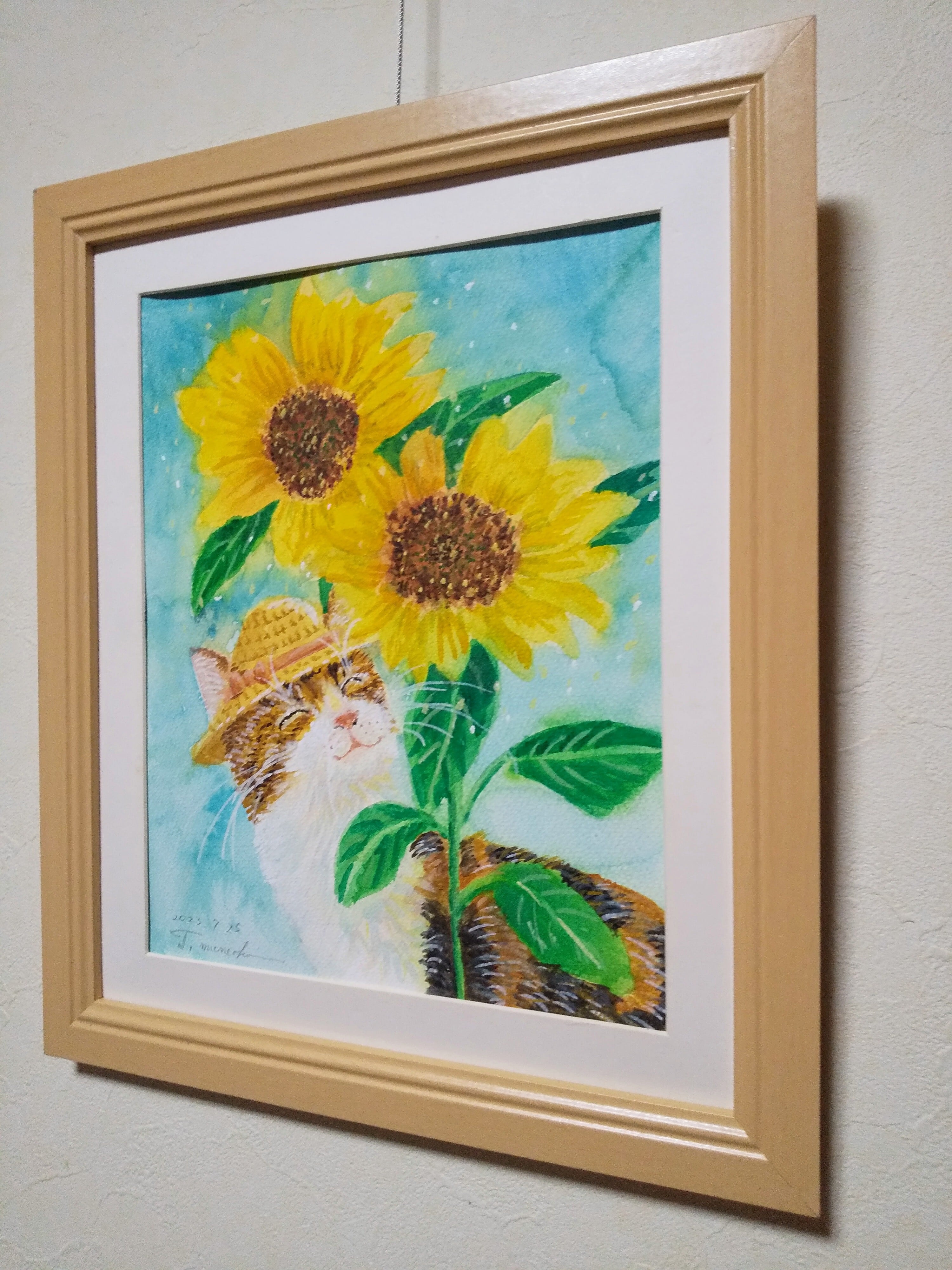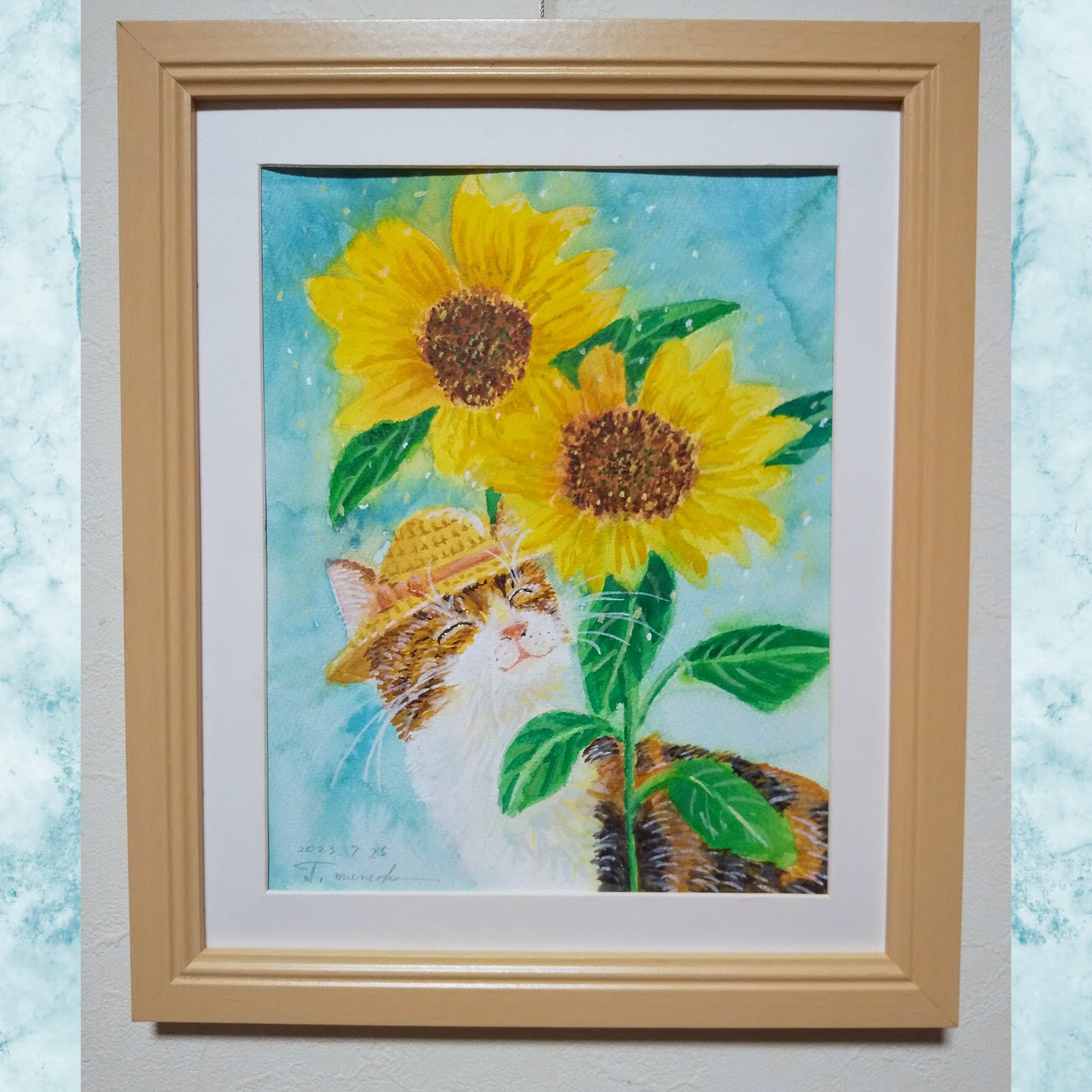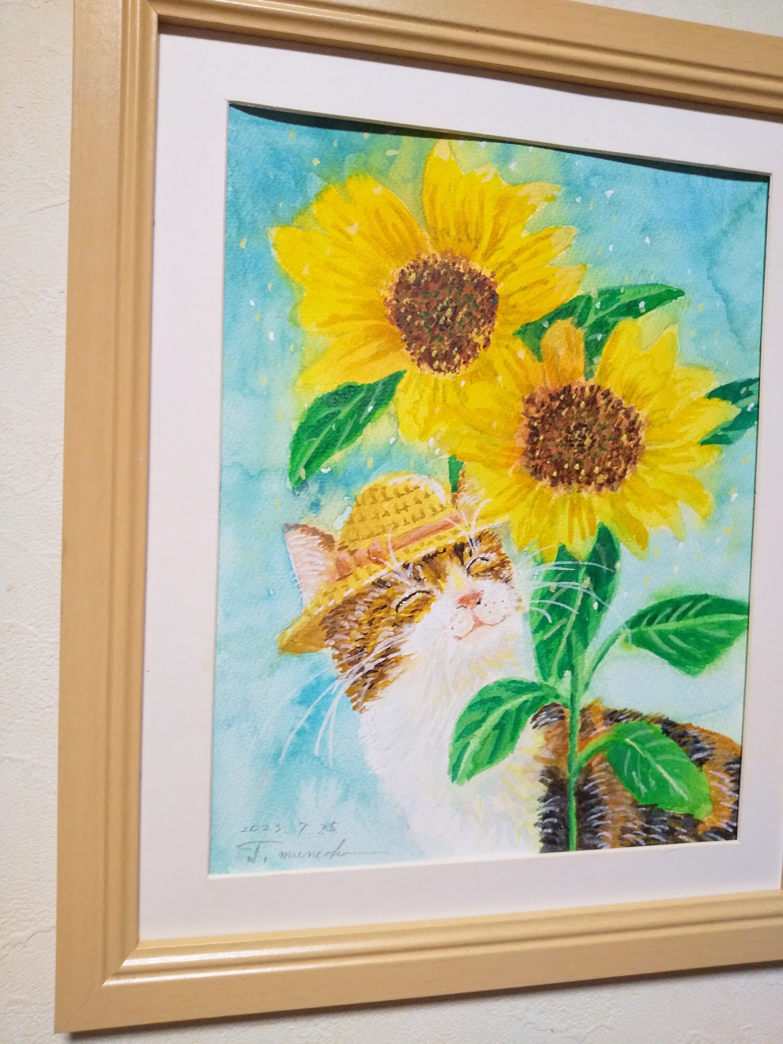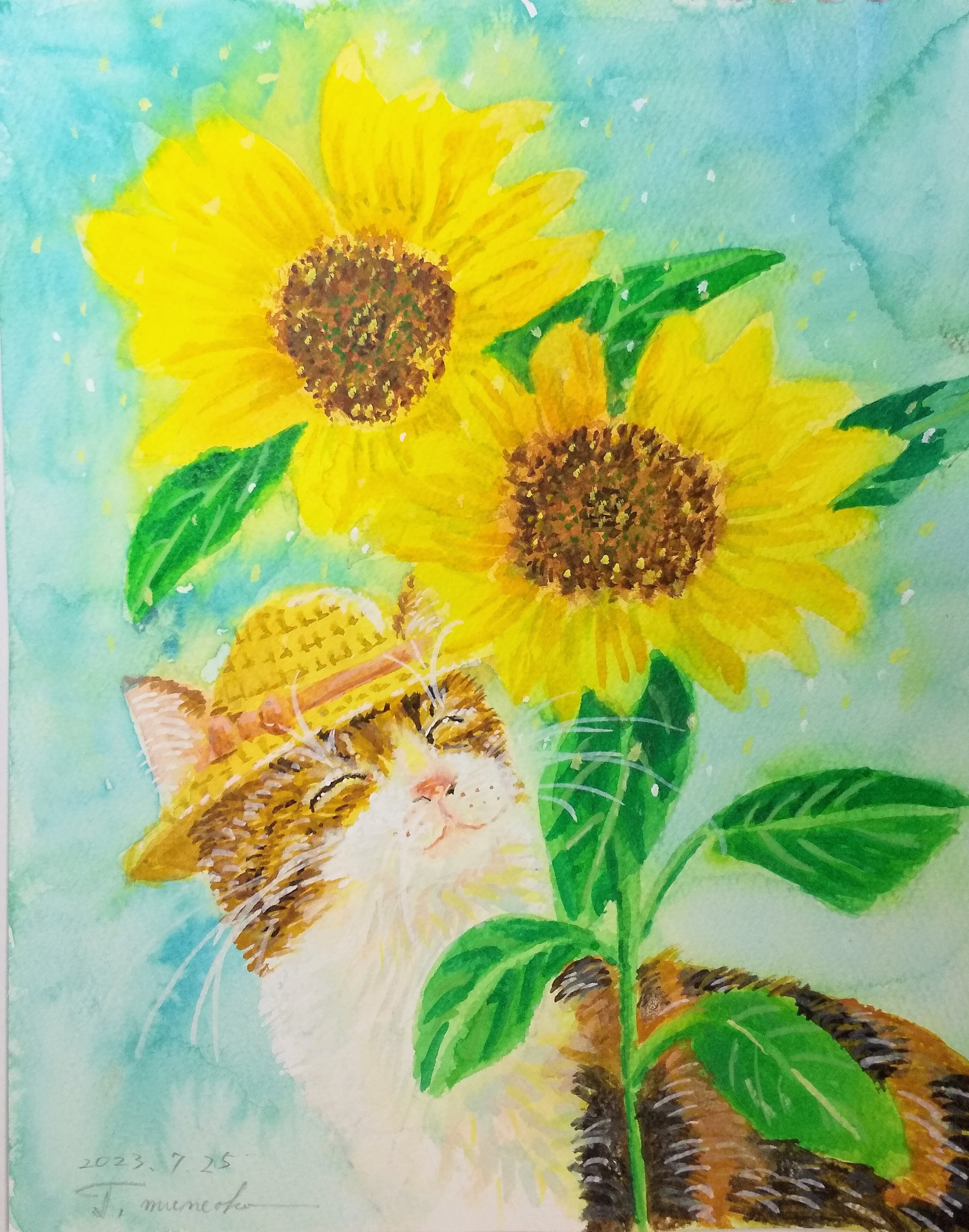 ヒマワリを見て明るさを少しでも表現したいと挑戦しました。ヒマワリの下麦わら帽子のアサちゃんがヒマワリに挨拶をしています。